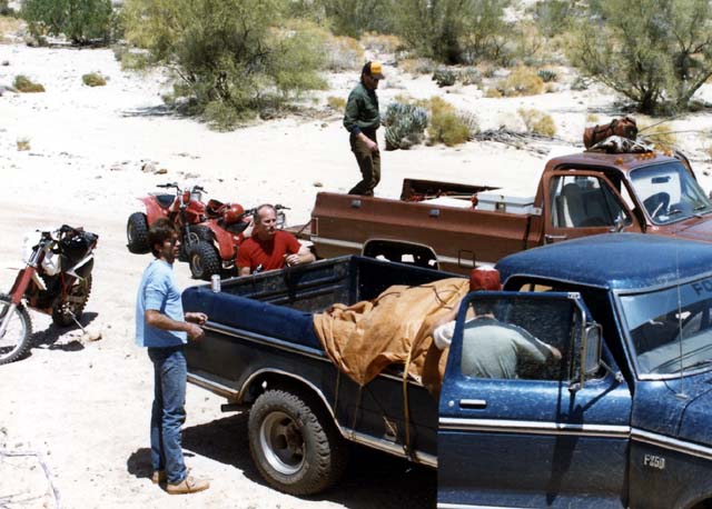 Below, the group saddles up for the first part of the trip to San Felipe. My 3 wheelers are loaded because the dirt trail back to Mex highway 3 is unremarkable and not all that much fun on a 3 wheeler. Plus, we could not keep pace with the bikes. You can see the red tile roof of the hotel office in the left center of the photo as well as the various radio antennas at the facility. The bar and pool room is behind the fellow in the bed of the truck on the right.