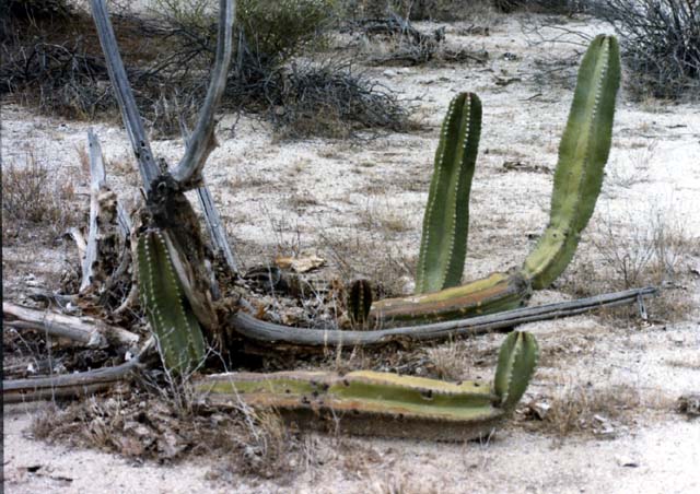 As we made our way south, there was plenty of flora to capture our attention. One rather rare item is the so-called "Creeping Devil" cactus, below. The creeping devil is interesting both because of it's propensity to grow along the groud and the fact that the sap is toxic. When the natives dominated this region, the used the sap from crushed cactus to fish. They would toss the crushed pulp into calm bays and the toxin would stun the fish, causing them to float to the surface to be caught. This was mentioned in several of the books I had read in preparation for the trip. None of the books mentioned what the toxin did to the indians that ate the fish, however. Nor did it mention the effect of the raw juice on humans.