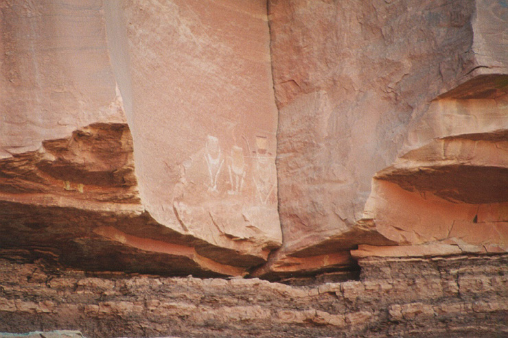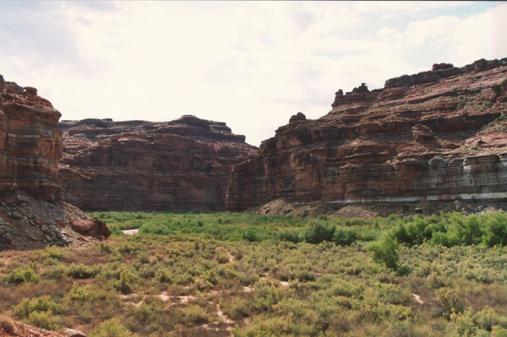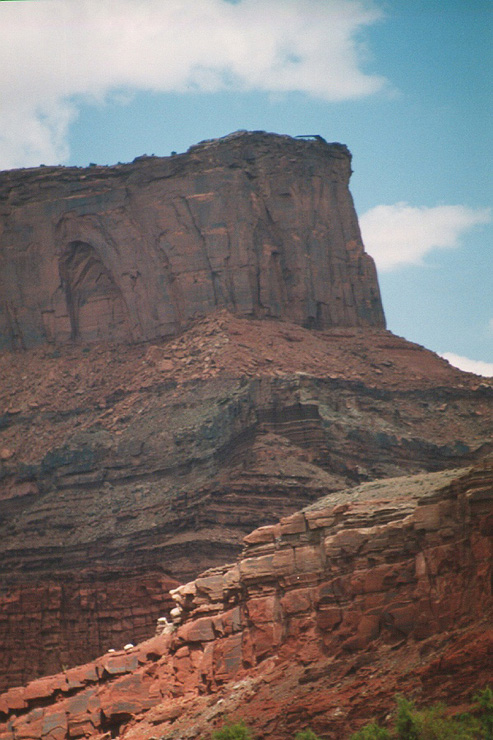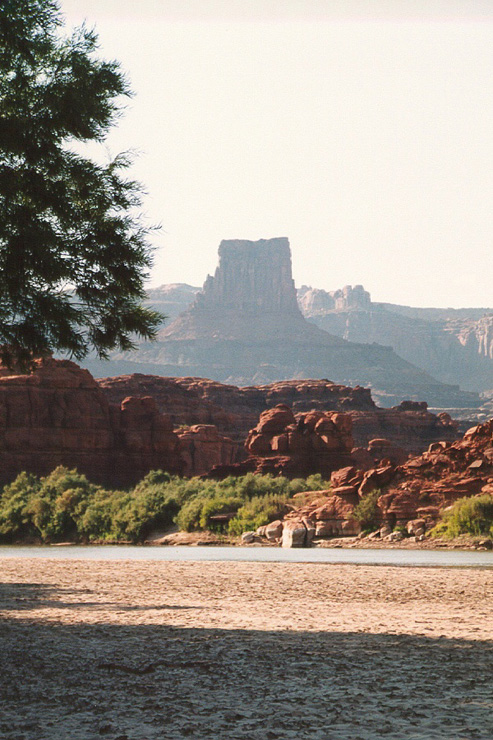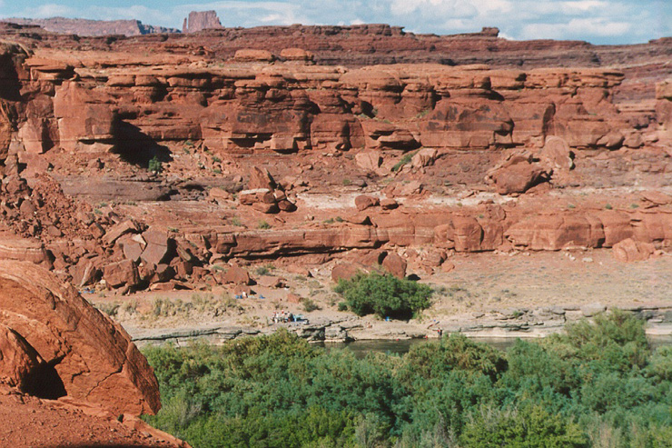 View across river from granery. Granery is substantially above river grade to protect it from flooding. Note party camped on opposite bank. Island in the sky in the distance
