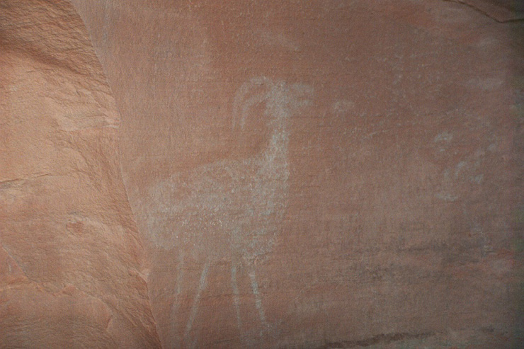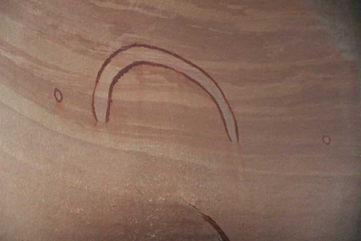 Indian pictographs made by blowing powdered pigment through a reed and using hands as the mask.