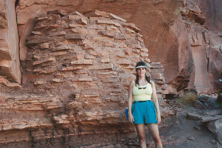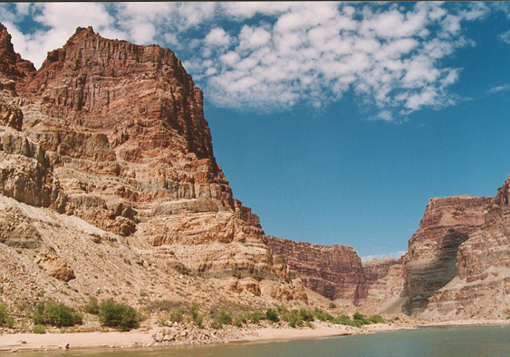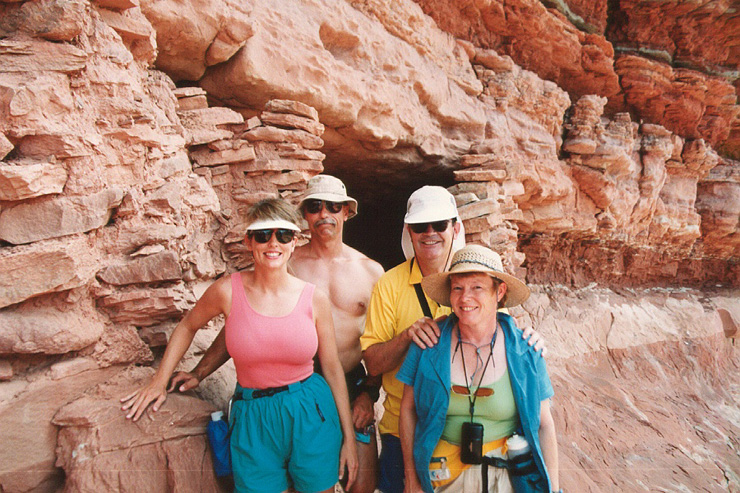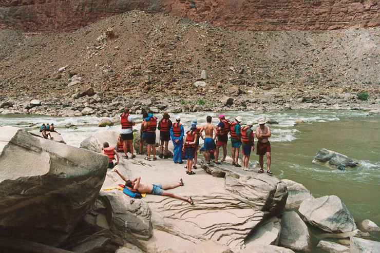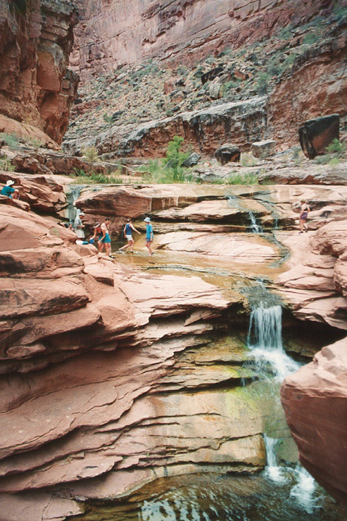 Exploring a side canyon with a small waterfall. We got back to camp after dark and the boatmen had prepared a fine meal and presented it in evening gowns and tuxes. All in all, an excellent trip with good, albeit hot, weather.