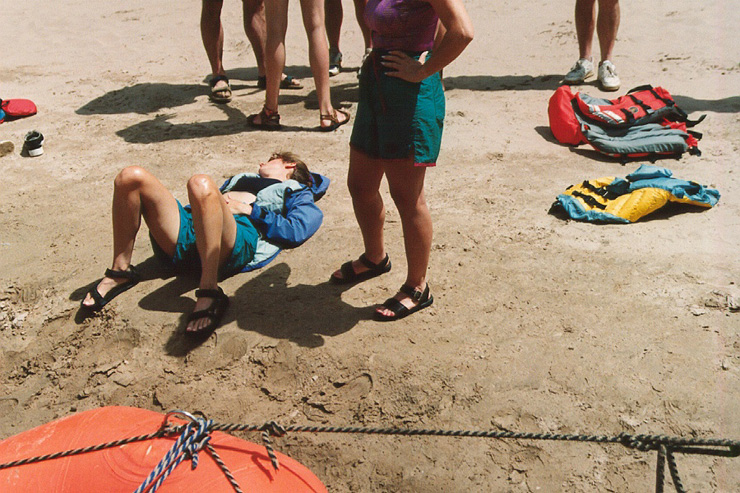 We wrapped the raft over a large rock at the top of the rapid. Kathleen fell out and did the balance of the rapid in the water, swallowing a large amount of river water in the process. Here she is recovering on the shore. I think she was quite scared by the dunking.