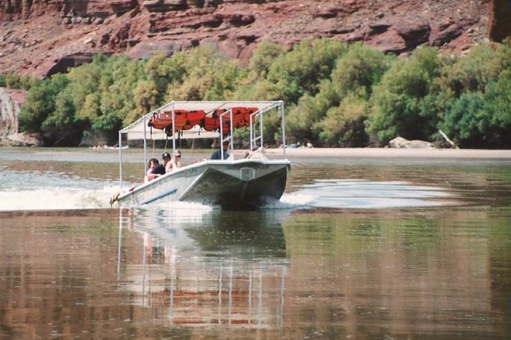 Canyon Lands Tour boat coming up stream from trip to confluence with the Green River .