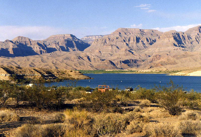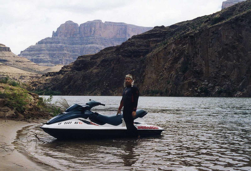 After I bought my Unimog, I decided that I needed something to pull behind it, so I bought a jet ski. I got the top of the line SeaDoo for that year. It was a fun ski, but later developed many mechanical issues and eventually sank. Fortunately, we did not have any issues with it on this trip. Looking at the map, we decided that it would be fun to go to upper Lake Mead at a place called Pierce Ferry. The plan was to launch at the Ferry and run upstream into the lower Grand Canyon. Since it was Memorial Day, we expected it to be hot (it was very hot in the lower deserts near San Diego). But, we were wrong. We had mostly cloudy skys and rain on several days. And, unbeknownst to us, the water in the river was frigid cold -- 42 degrees. The temperature was not due to the season or the weather, but rather the fact that the entire flow of the river was output from Glen Canyon dam and was that temperature all year around. The photos below are scans of chemical pictures.