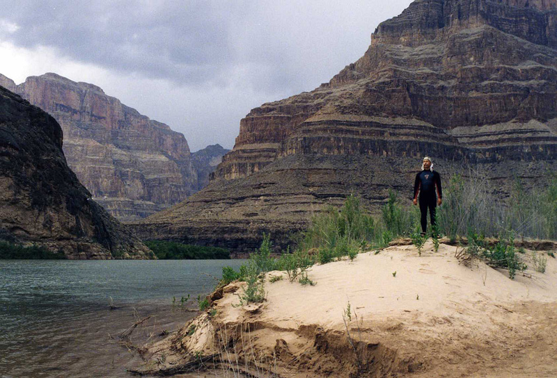 On the day of our trip into the canyon, it was cloudy, rainy and cold. We wore our 3 mm wet suits, but they were insufficient for the cold water. Plus, we discovered that rain, even light rain, at 50 mph is like getting hit with a BB gun and really stings. We traveled upstream for about 1/2 a tank of fuel and then beached the ski. Here Kathleen shows her style.