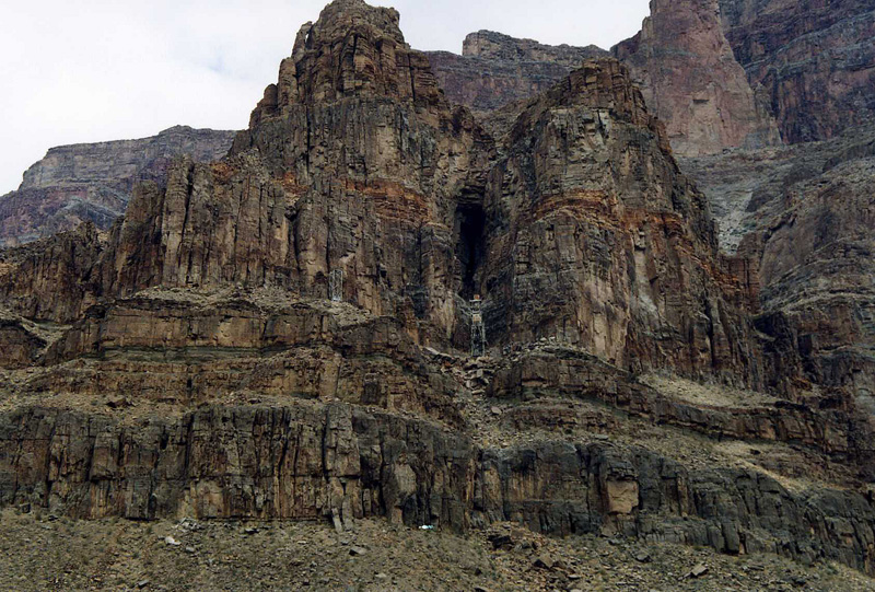 Here is another view of the cave. Note the hoist tower just below the mouth of the cave. In the 1960s, there was an airplane crash here due to the haulage cable. Some fighter jock was flying low in the canyon and hit the cable and sliced his plane in half causing him to crash.