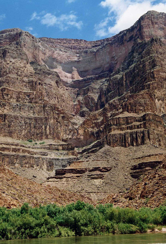 Around the 1900s, there was a guano mine in the canyon. Back then, the nitrate concentration in the guano (bat droppings) was used to make explosives. The mine was on the opposite side of the canyon from this shot and there was a cableway that spanned the whole river. The hoist house is visible on the skyline of the mesa near the center of the photo. From here, they pulled cable cars filled with bat shit to the south cap rock for trucking to the factory..