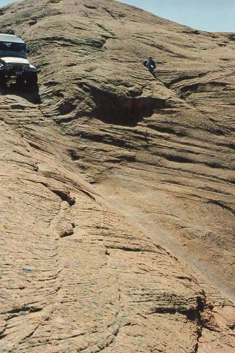 A steep exit. Note rubber marks on the rocks. Kai is videoing the event.