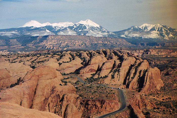 Fins and the beautiful La Salle Mountains near Moab, UT .