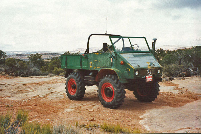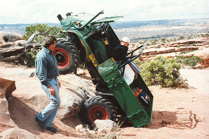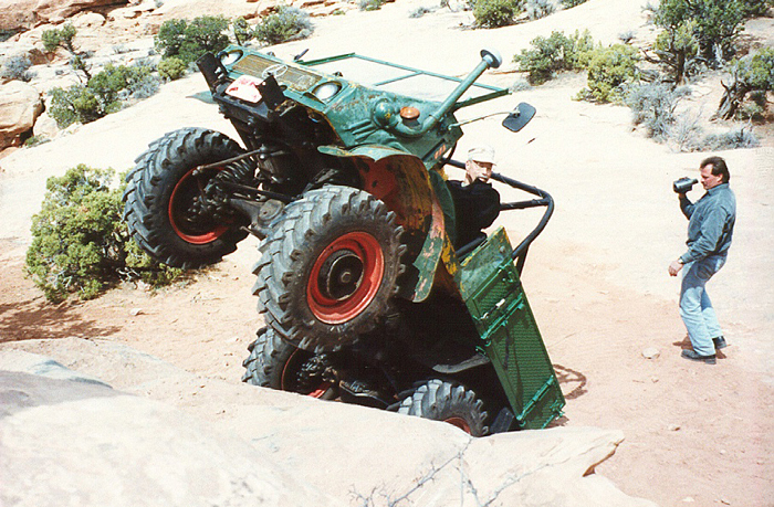 This was a mistake as opposed to a staged photo event. Kai had just got up Rock Chucker Hill (this obstacle) with his 406. I figured that I could do thet same, so I pointed the minimog on the same line and put it into low gear. I new that the first ledge would be steep and result in a large angle, but I did not count on the rear tire hooking under the ledge. Once the tire hooked, it could no longer turn. Instead, it turned the truck instead, resulting in me standing on the tailgate. I was sure that I was going over. From my point of view, the danger was real. Kai, on the other hand could see things from a different perspective and knew that I was not in immediate danger and insisted that I hold still for a photo opp. Note the video in his hand.