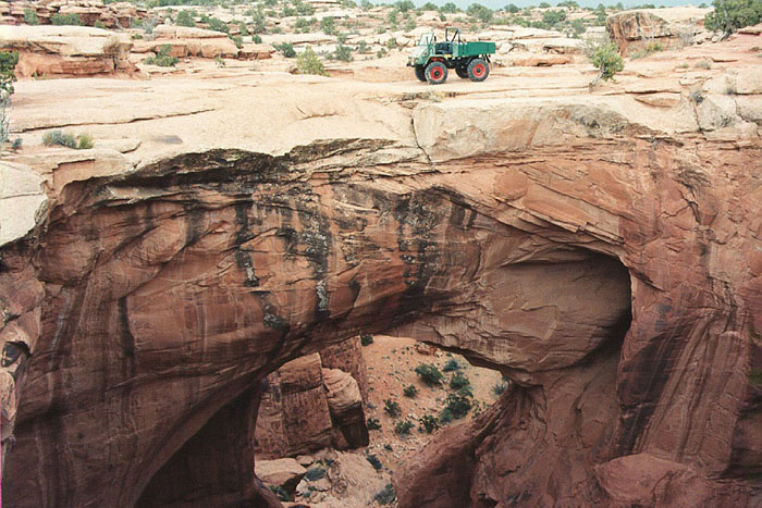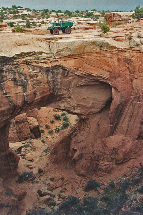 Minimog on Gemini Bridges. Driving across is very scary, it is a long, long way to the bottom; many hundreds of feet. It would be a one-way trip home in a body bag if you slipped.