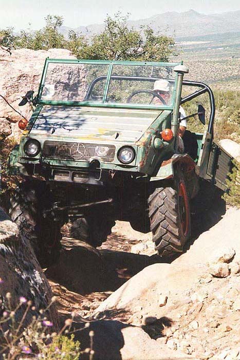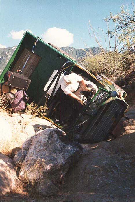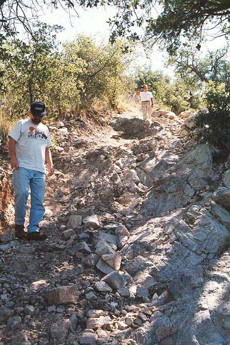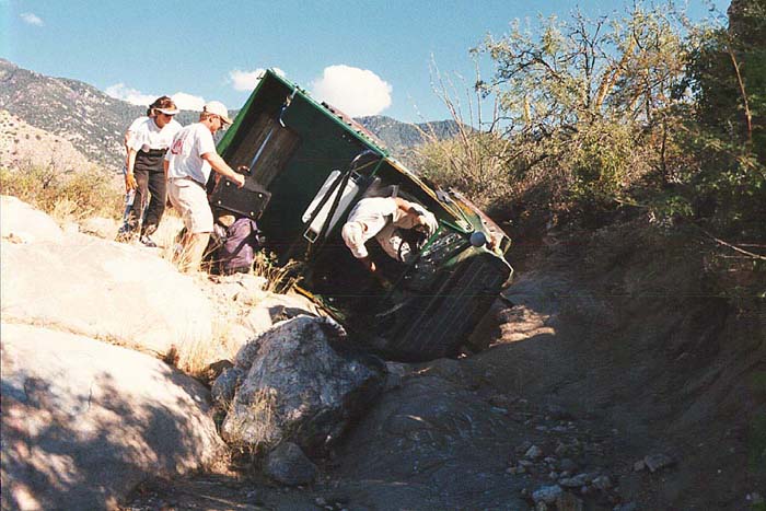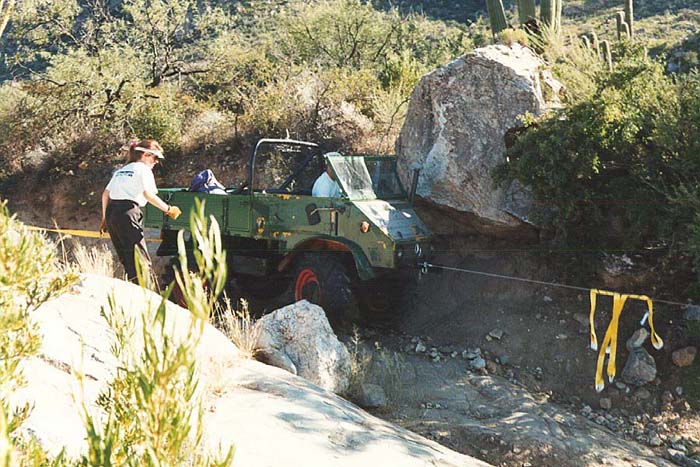These photos were taken in September 1998 at the Tucson Rough Riders Trail Dust Days 4x4 festival. This trail was Romero Canyon on the north side of the Santa Catalina mountain range. The Catalinas have peaks that are nearly 10,000 feet and the terrain is very rough. Romero canyon is a dead end, terminating short of the main ridge of the range. On this run, only 3 vehicles elected to run the trail. I had come from San Diego especially to attend Trail Dust Days (TDD) to run trails with the 411 and the Rough Riders. This section is narrow, and has big ruts.