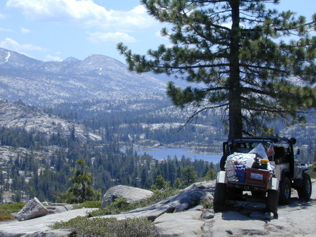 [Back to Index | Previous Photo | Next Photo ]Still high in Slab City, this was the groups first view of Buck Island Lake. Mike Bennett, our guide and gracious host, has been on the Rubicon trail many times, as has Kai. Being my first trip, I was captivated by the great scenery. Note the snow fields on the ridge to the left of the shot.