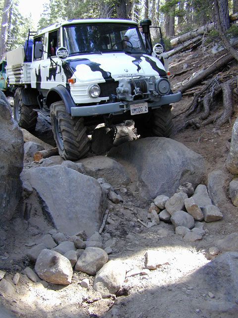 [Back to Index | Previous Photo | Next Photo ]Still in the Big Sluice, this obstacle offered the biggest challenge for the 416 due to the dropoff combined with trees on the right and the boulder on the left. During the drop, the bed actually contacts the boulder leaving a small "beauty mark".
