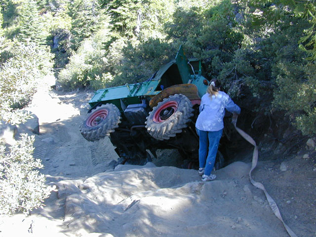 [Back to Index | Previous Photo | Next Photo ]Cadillac Hill takes it's first victim in our group. The obstacle, unnamed as far as I know, was a face about 6' high. I'm not quite sure what happened to cause the roll, but no damage was done and no cargo fell out. Here, Kathleen is attaching the strap prior to righting the 411.
