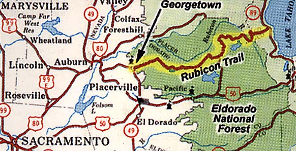 The Rubicon trail traditionally starts at Georgetown. However, the early portion of the trail is "just a dirt road" and offers no significant off road challenges. So, in the interest of both time and patience, we elected to start the trail at Wentworth Springs and get right down to it. The map below shows a high level view of the trail location. The group from San Diego required a 2 day drive to get to the trail head, in the process traversing most of the length of the state of California and half the width of the Sierra Nevada range.