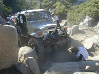 After negotiating these initial obstacles, we came to the first REAL obstacle - Devil's Post Pile. For a short wheelbase vehicle (66") like the 411, the height of the obstacle represents a substantial fraction of the wheelbase resulting in over 45 degree angles and true fear on ascent. In this case, a combination of a diff-lock that would not stay engaged and a co-pilot's unwillingness to stay in the vehicle for the obstacle resulted in the requirement to do some road building. 2 hands are required to steer, one hand to operate the diff-lock and one hand to engage the starter. Clearly, next generation off roaders should come with 4 hands!