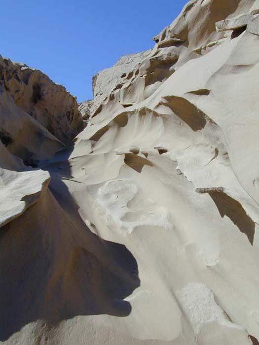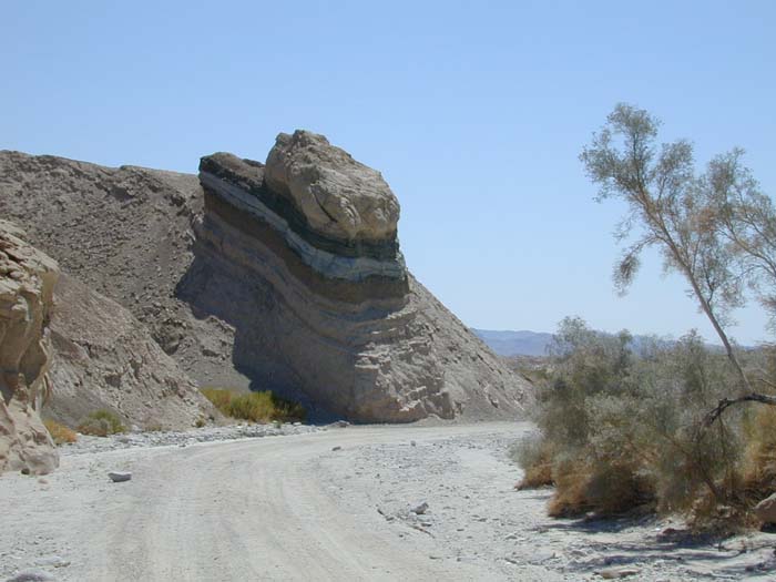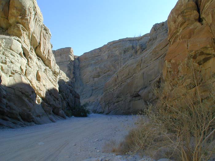We made a summer solstice trip to Sandstone Canyon in Anza-Borrego State Park. Since this was the solstice, it was hot. Very hot. In fact the canyon walls were very similar to an over. It made it quite hot even after the sun went down. But, we hauled out the futon pad and slept in the open and it was pretty nice. There are few things that plenty of beer will not solve. The was one odd thing that happened. On the way in to the canyon, we noticed that there was a red mini-truck parked in the wash. We did stop to investigate, but found only tracks heading upstream. We got back in the mog and headed to our camp and did not see anybody until we left.