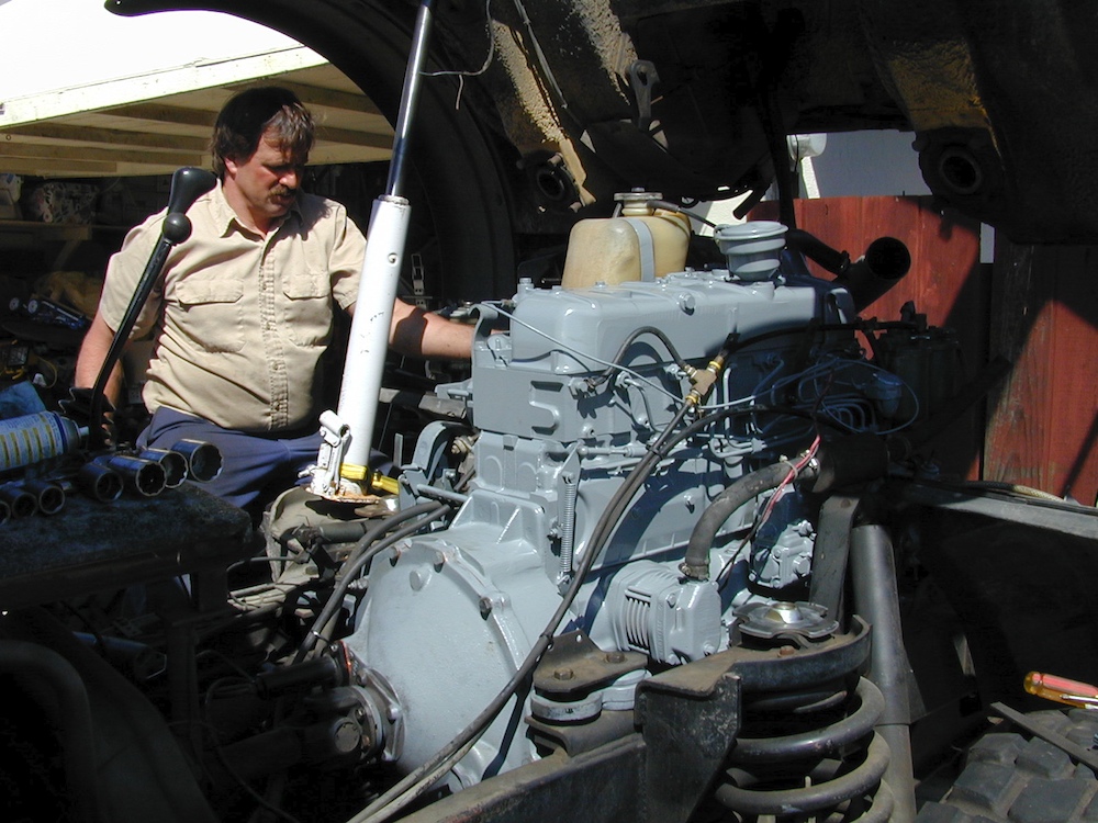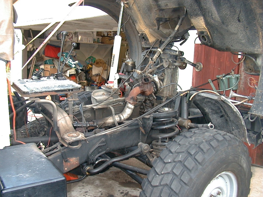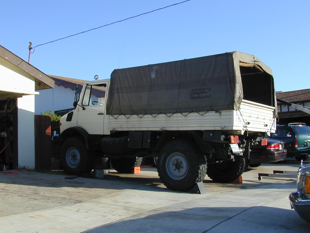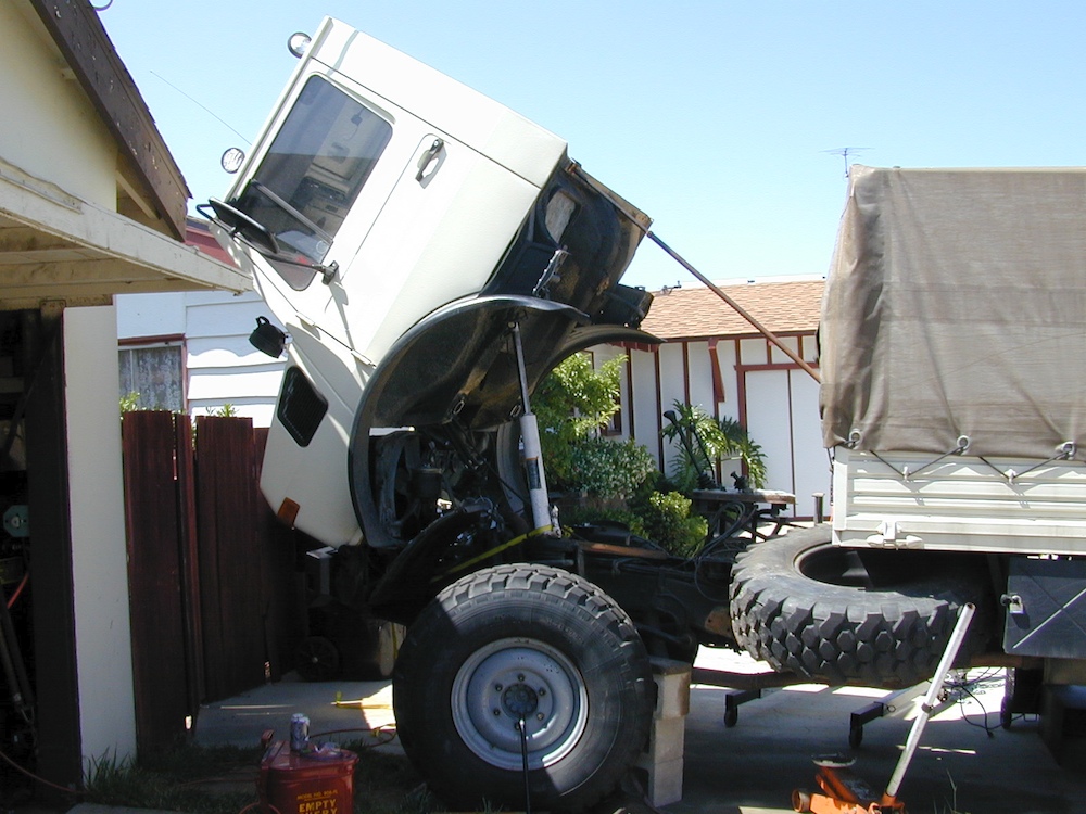 These photos were "lost" for quite awhile until I found them under the wrong folder on the computer. My 1300L Unimog suffered an engine failure and these photos describe the removal of the motor and installation of a brand-new crate motor from Mercedes-Benz in Germany. This effort was big and spanned about 6 months all told. The failure happened in December 1998 and the truck was finally ready to roll the last day of May 1999.
