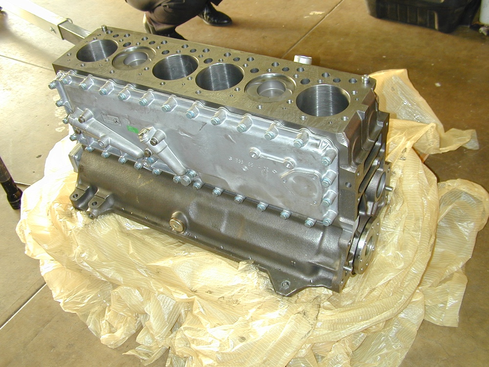 Houston, we have a problem. Note that the #5 and #6 cylinders have deep scars. If you look closely, you can see the crack in the #5 cylinder (the one toward the bottom of the photo) that is in the web between the cylinders. This means either the block needs to be replaced or it needs to be re-sleeved. I opted for a new block.