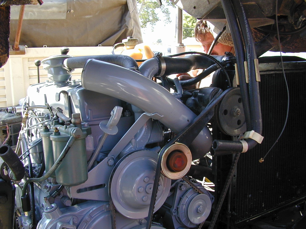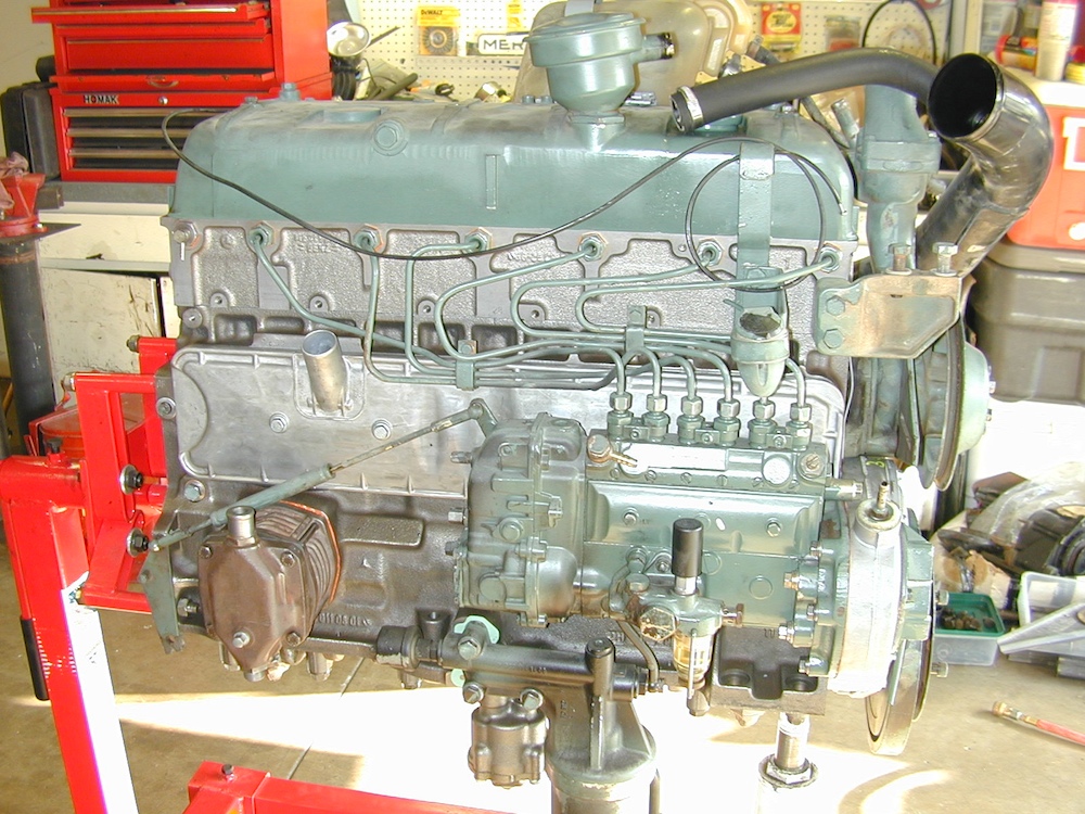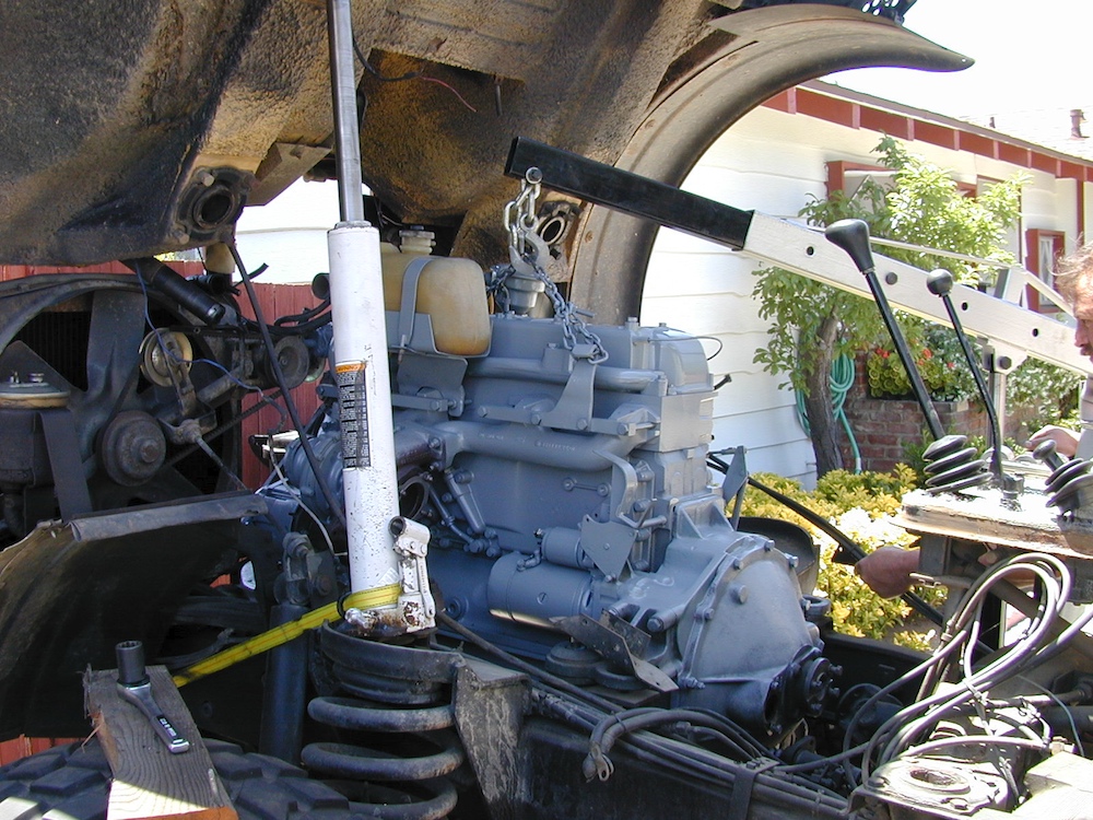 The cab on the truck was tilted again to allow reinstallation of the completed engine.