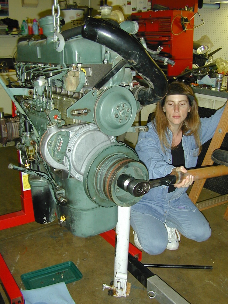 Kathleen assists Kai in getting the harmonic balancer correctly torqued.