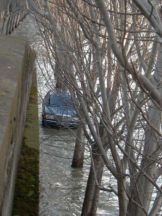 The Seine river was at flood stage. This unlucky fellow left his Mercedes in the way.