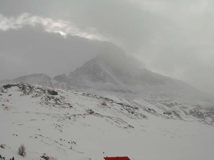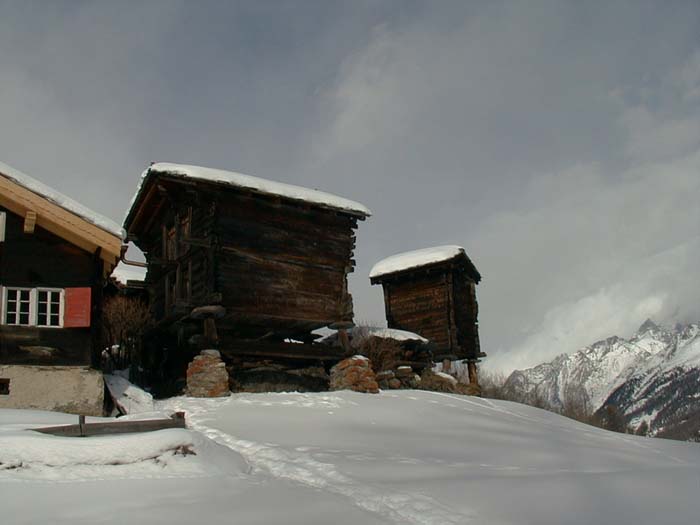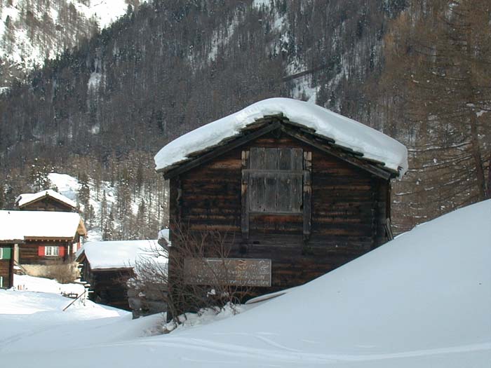 This would be an acceptable ski day. The weather was closing in fast, so we decided to ski off the ridge. As we headed that direction, the clouds thickened. The mountain is tall enough to cause its own weather. We passed some interesting chalets on the trail.