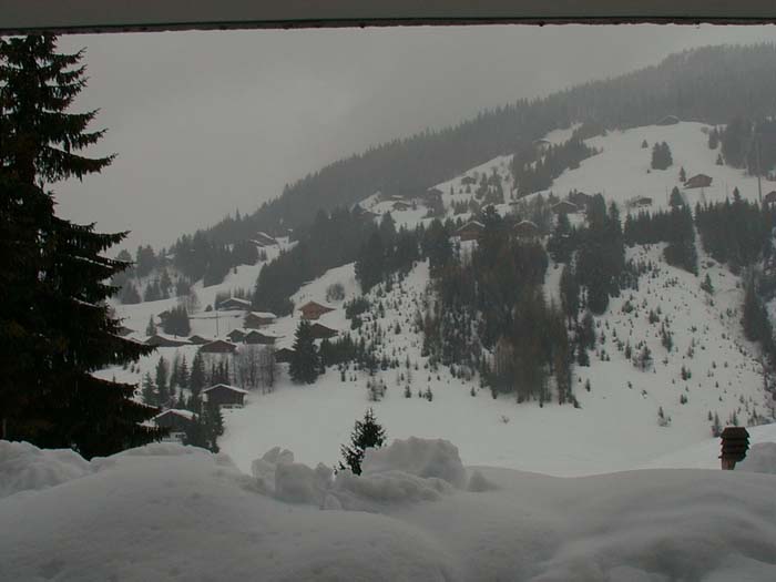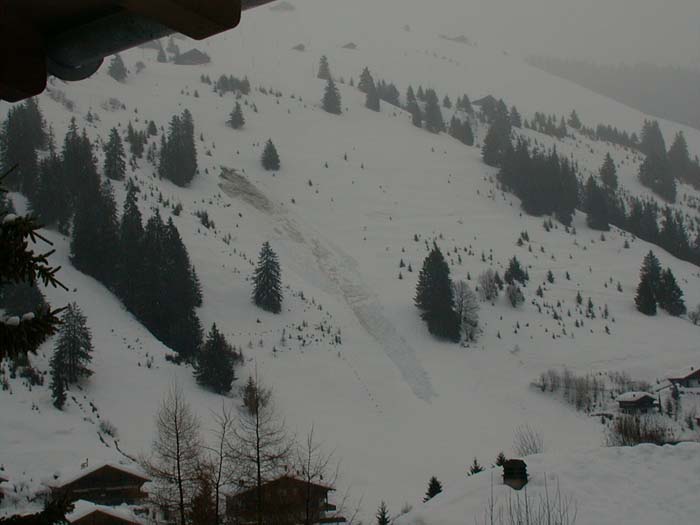 An avalanche across the canyon, visible from the window of the chalet. We heard it too.