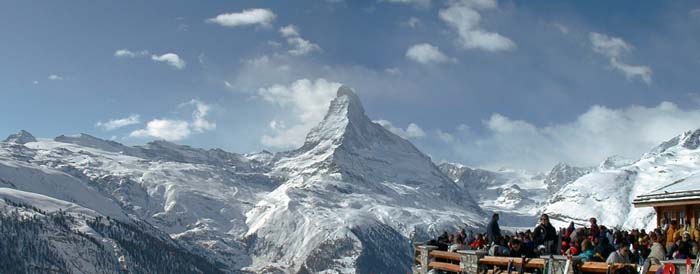 Our good friends Bob Lois Means suggested that we do a ski trip to Europe. The plan was to head to a place called Zermatt. I did not know, but Zermatt is at the base of the Matterhorn, arguably the most famous mountain in Europe. After Zermatt, we would go to Lausanne to see some of Bob's ex-work mates and from there Paris. It was an outstanding trip in nearly ever respect except the conveyences. Air travel, particularly intercontinental air travel is an assault on the senses. And there is no escape. It took us nearly 30 hours of clock time to get from San Diego, CA (our starting place) to our initial destination of Zermatt. San Diego to San Francisco, to Paris, to Geneva, then on a bus for 4 hours to a railway station. Then onto a cog railroad and into Zermatt. Quite a brow beating. But it was worth it as the photos below will attest.