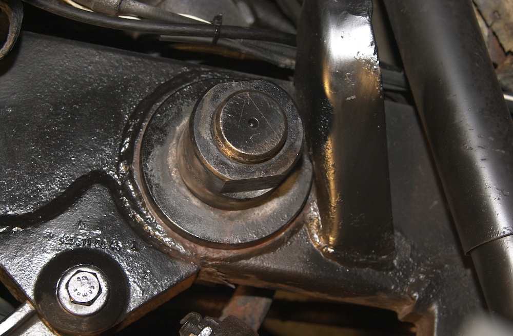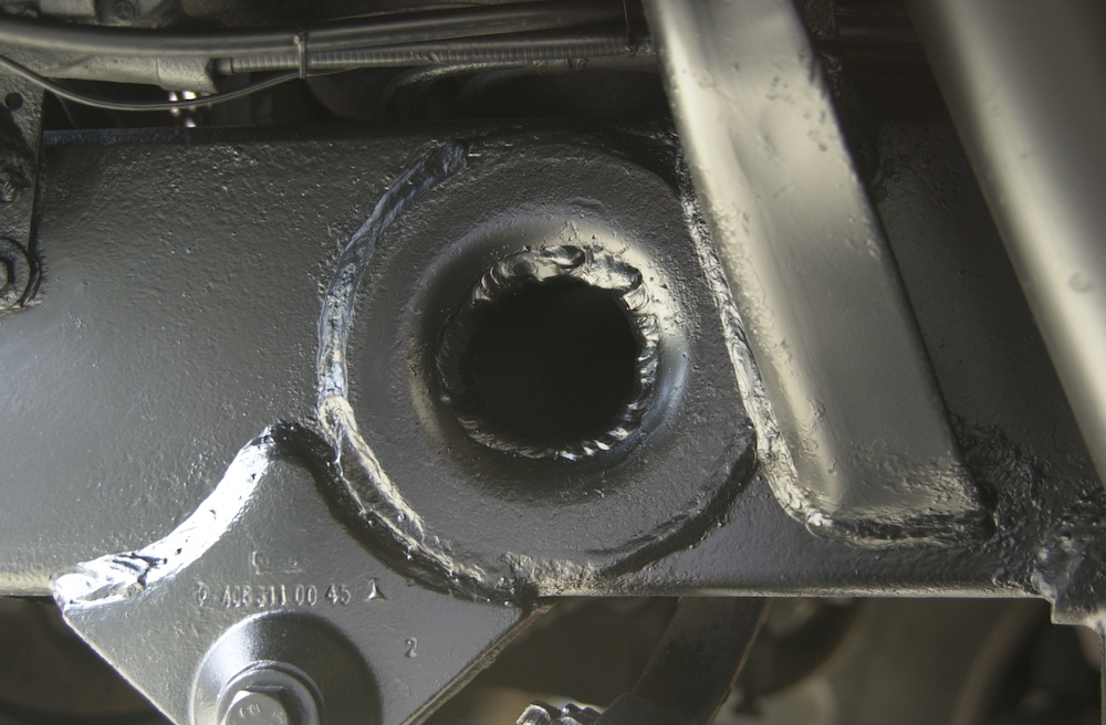 The area was cleaned and then "stick" welded to attempt to join the components solidly together. Note the chassis number along with the Mercedes 3-point star at the lower left of the photo.