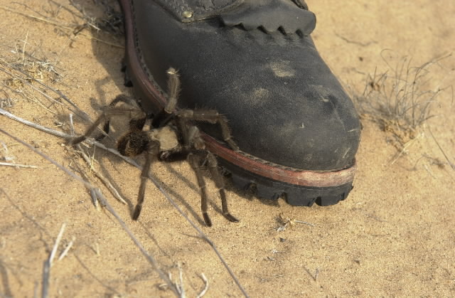 The deserts of North America are home to an amazing variety of wild life. The so-called Sonoran Desert is particularly rich in wildlife and insects. The Altar Desert, while in the state of Sonora, is in the ecozone referred to as the "lower Colorado desert". This area, near sea level in altitude, has much less wildlife due to the harshness of the climate. In fact, except for some sand lizards and one jack rabbit, the Altar Desert seemed devoid of life. On our way to Camp 3, we spotted a trantula near our path. These are big spiders, but they pose no hazard to humans unless you let them crawl on your boot.