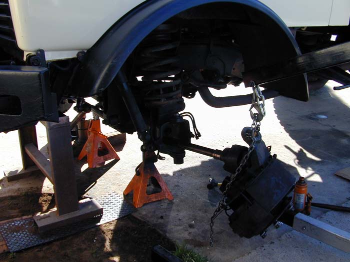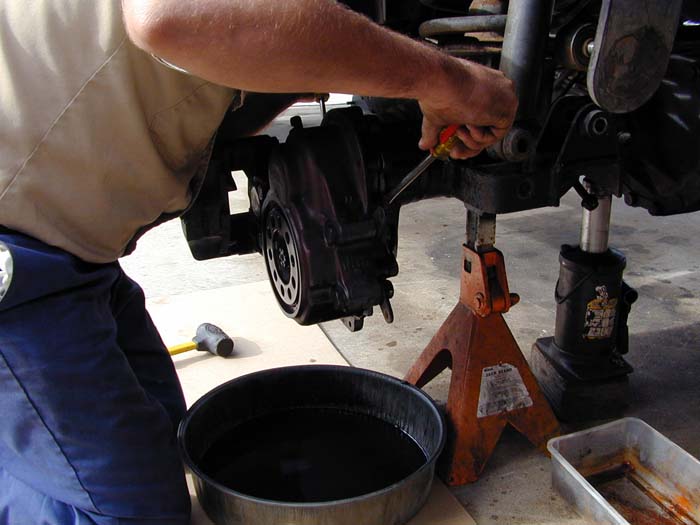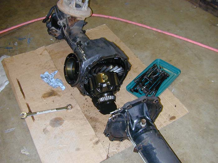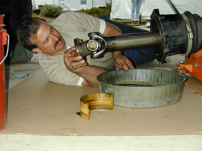 Kai removes drive shaft from torque tube with pan to catch oilt.