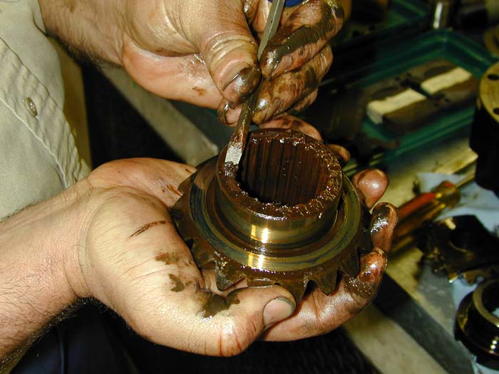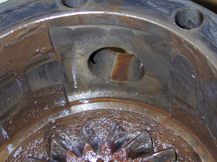 One of the old wheel gears -- note the wear groove in the bearing race. This gear is hosed.