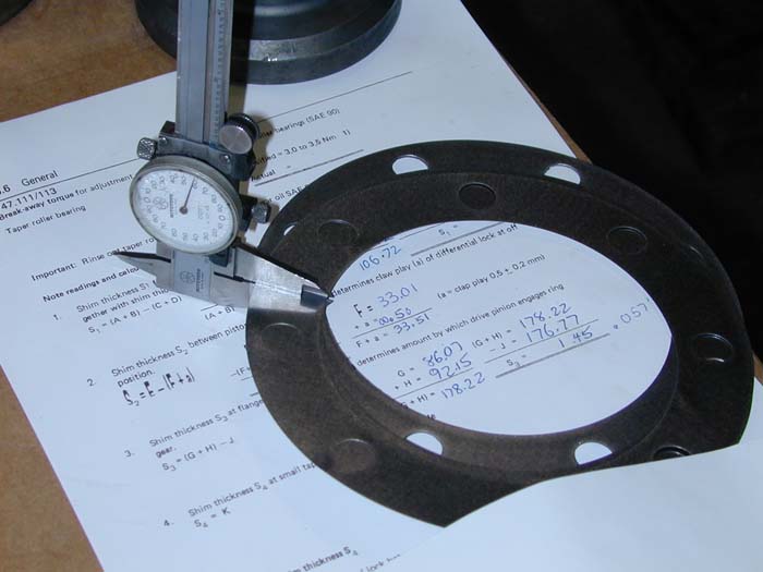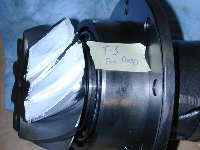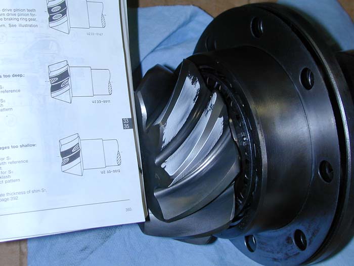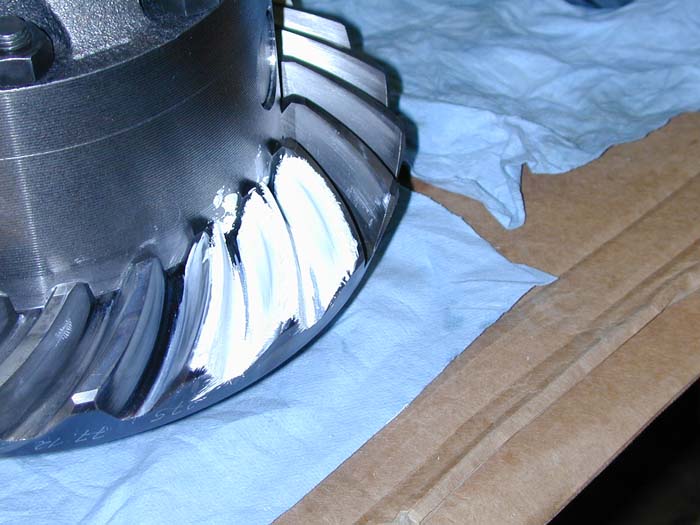 Checking the "gear wipe pattern" with white marking grease. Note the black stripe in the white area, this is the actual contact zone. This one is per the specifications and the manual examples.