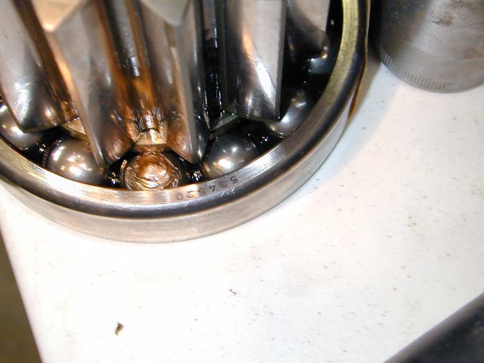 Inspecting wheel gear bearings. One of the balls was trashed (bottom center).