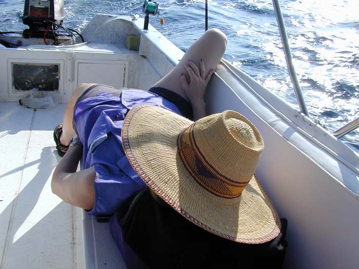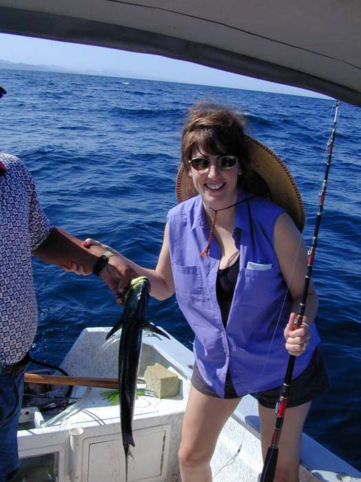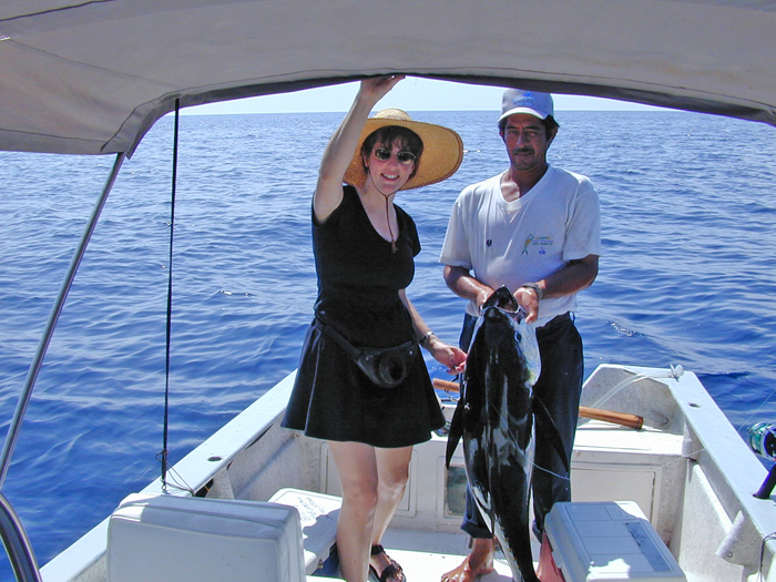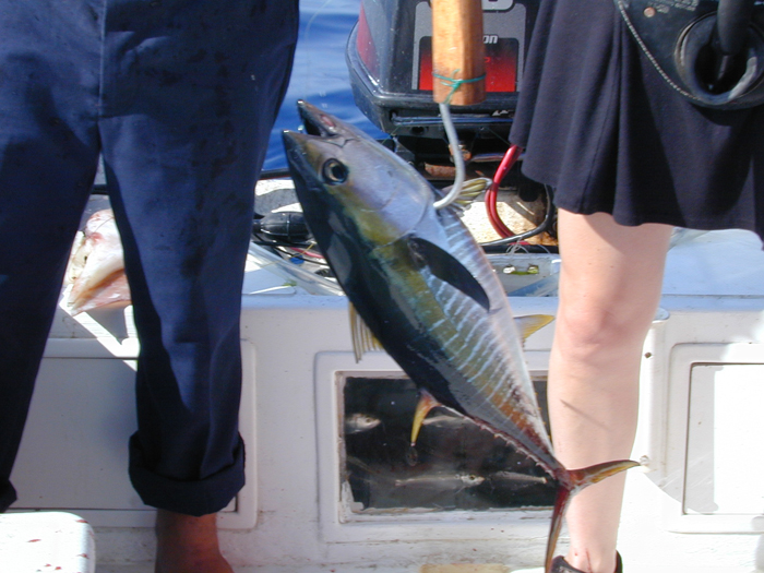 Kathleen catches a small tuna.