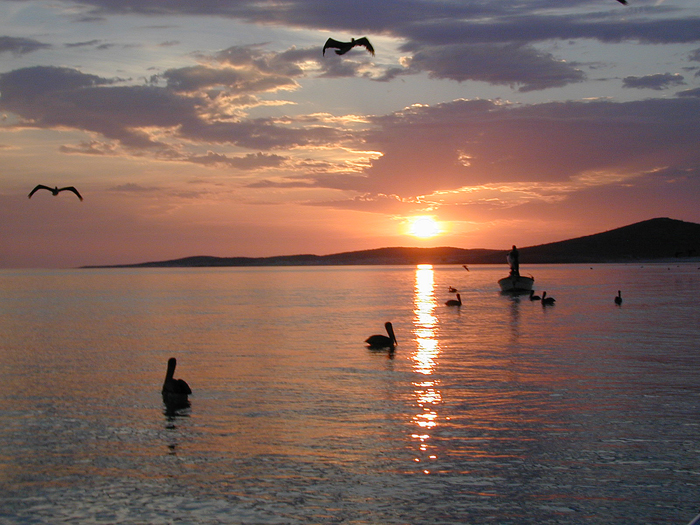 Pelicans at sunrise.