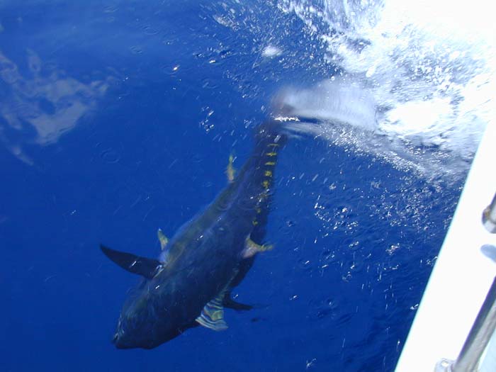 Kathleen catches a bigger tuna. One hundred pounds or so.