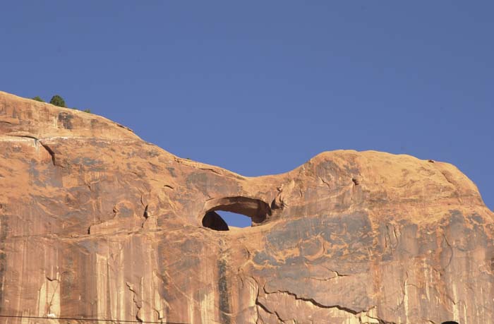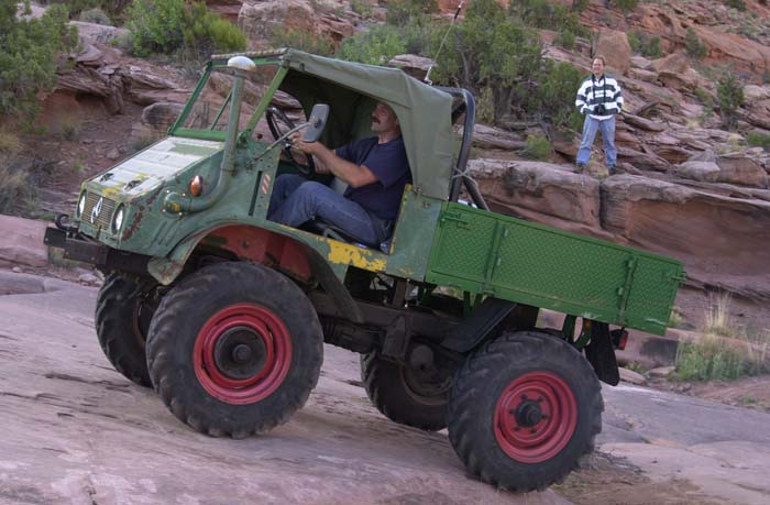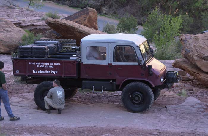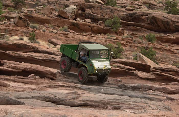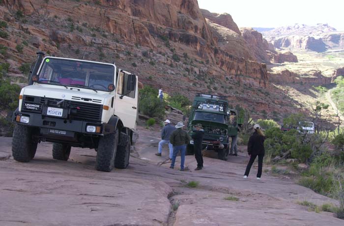 The Moab Rim Trail is one of the most challenging trails in the area. It has some difficult obstacles and the ever-present psychological fry that you are heading up the side of a cliff. Some folks have rolled and if you are unlucky enough to roll near the start of the trail, you go the distance. Rolls further up, while probably not fatal, will be expensive. As you will see in the photos below, you ascend a slab with a away-from-the-cliff cant on the trail.