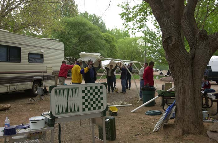 Fellow campers disassemble "Mog Central" in the Slickrock Campground.