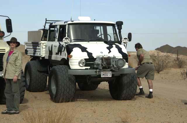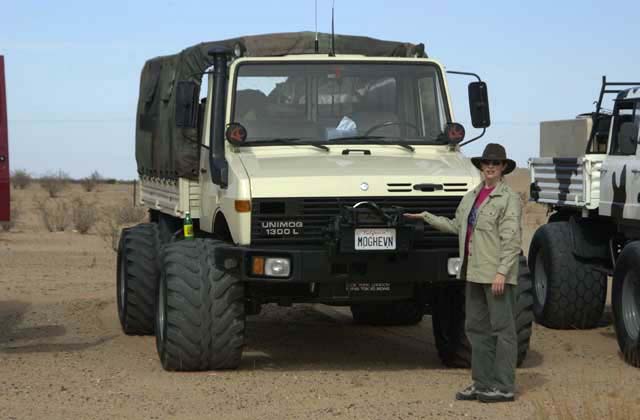 Photos of the individual rigs are below. First, the 1300L with Kathleen doing a reasonable Vanna White impression. For this trip, I purchased a used set of Goodyear 24x20 Terra Tires and custom rims to help negotiate the soft sand. As a "side benefit" the tires increased the track width to about 9 feet, giving good stability on side hills.