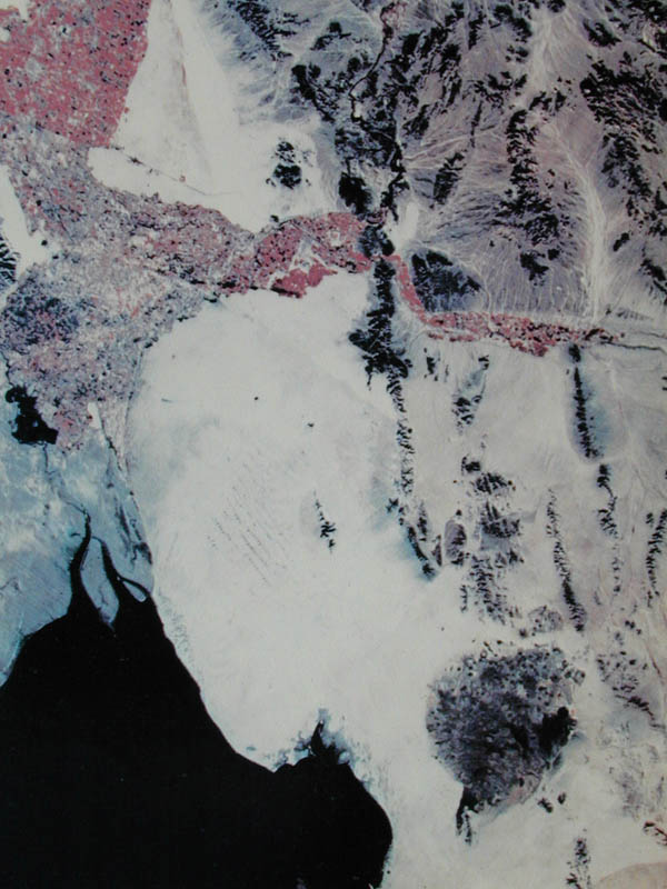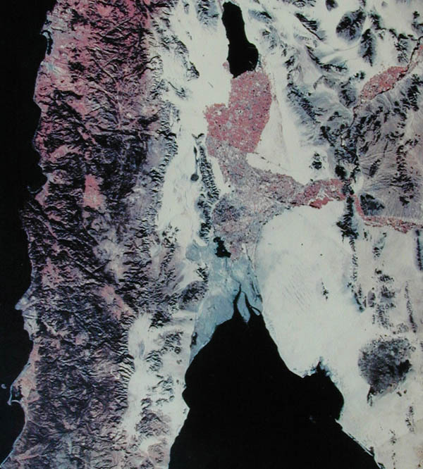 In Figure 1, San Diego bay is just below the top edge on the left. The large lake is the Salton Sea. Farmed areas are shown in red. The road in Mexico that parallels the border can be seen. Refer to the map below for reference.