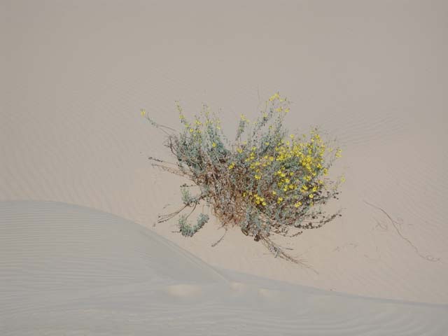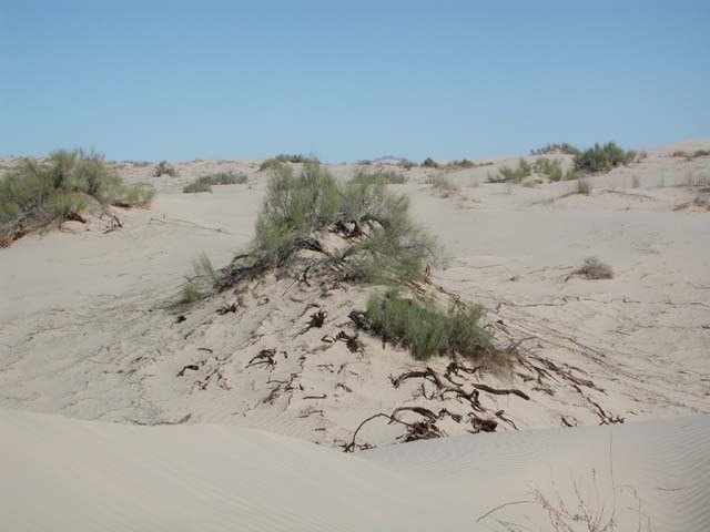 Below, you can see the root structure of the so-called Horsetail plant. The amount of greenery is minimal, the "leaves" are actually green rods about 1/8" in diameter and coated with a waxy substance to reduce moisture loss. The roots, however, are extensive. All the root matter in the hillock was due to the same plant. These roots serve to keep the desert in place, and as you can see, without them, the sand continues to blow.