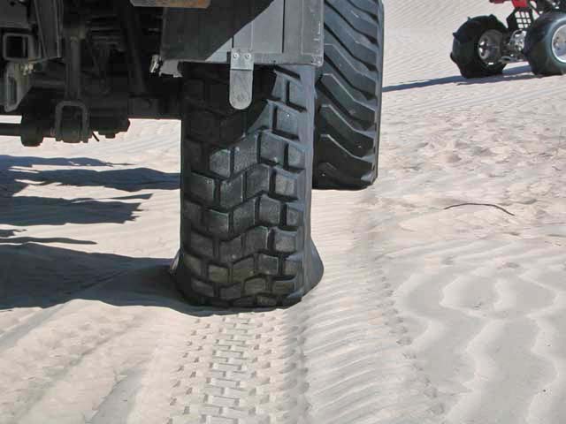 The photo below shows the difference between the stock 14.5R20 tire (rear) at 15 PSI and the Terra Tires at 12 PSI (front). Operation of the tires at low pressure and high speed (more than 20 mph) will cause sidewall damage as we will later see. The truck performed acceptably well in this mixed-mode configuration.