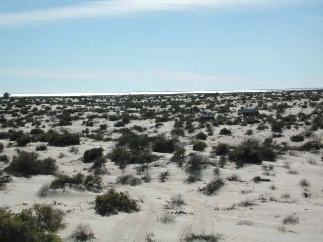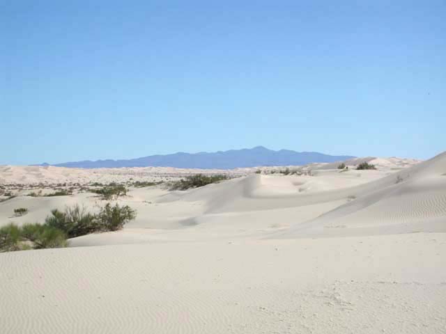 One of the 2 defining features on the horizon in the Altar is Sierra Pinacate. Below, the outline of the volcano can be clearly seen against the northern skyline through the dunes. Los Pinacates, also known to the locals as Los Vidrios (the glass, as in obsidian the volcanic glass) threw out great amounts of ejecta that traveled for miles. And, as shown in earlier photos, the black sand has intermixed with the river delta sand that is the predominate component of the Altar dunes. Los Pinacates are clearly visible in satellite photos Figure 1 and 2 on the home page of this trip report. There you can see that there were many vents, but one primary cinder cone.