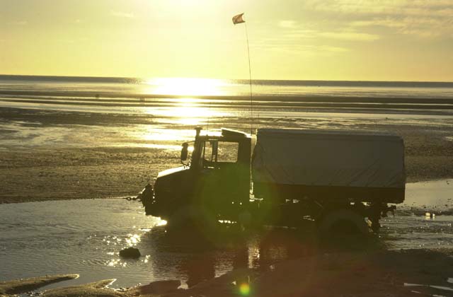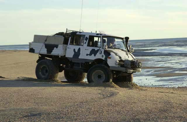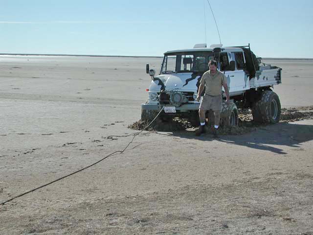 One of the biggest problems in getting stuck in these areas is that there is nothing to winch to. There are no trees, no rocks, nothing stable. As you can see below, Dan is in deep. He is buried right to the differentials. Note the bow wave of mud on the front of the wheels as Kai attempts to pull him out. The sand here is composed mostly of broken shells. It is unstable, and very sharp on the skin. As we struggled to get Dan out, the tide continued to advance, raising our concerns to a fever pitch. If we could not get his truck out in a couple hours, it would be covered to the bottom of the canopy, with obvious consequences.