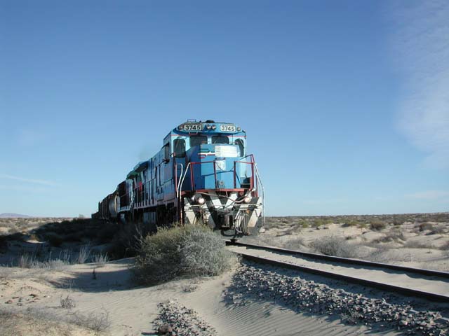 We crossed the tracks and followed the dirt road for a number of miles. I was on the quad and while stopped waiting for the trucks, I happened to look up in time to get this photo of an actual train. The tracks are not heavily used, or at least were not while we were traversing the road for several days. But, it is the only fast way across the Altar as there is no road. The engine looks like an GM EMD GP-35 based on the dropped snoot.