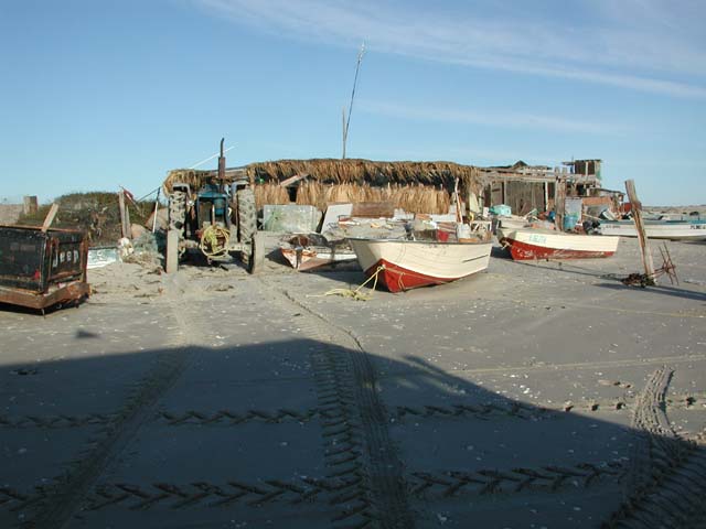 We traveled along the railroad tracks for many miles until we came to an abandoned railroad town; I did not take photos as it was unremarkable. There we crossed the tracks and assumed that there would be a track that would take us directly to the water's edge. We were correct in our assumption and in only a few miles, we were on the beach. We turned east toward Puerto Penasco (Rocky Point) and planned to follow the beach to the town to buy shrimp, clams, ice, beer and diesel. After a short stint on the beach, we came upon this small fish camp. We stopped to see if they would sell their catch, but nobody was home. The place was actively inhabited, so they must be out working for a living. Note the tractor. The curious thing is that the palm fronds that were used for the walls had to be imported from somewhere else, as there were no trees of any kind in sight.