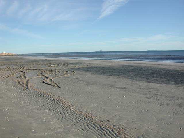 As we progressed down the beach, I was getting progressively more nervous. First because the light was waning and we still had a long way to go to get to Puerto Penasco. Second, because we had been traveling all f**king day and I was tired. Third, the tide was out and the beach sand was very soft. Below, you can see that when the tide is out, the beach goes far into the water. The recent high tide was fresh in our minds as we chose our path down the beach.